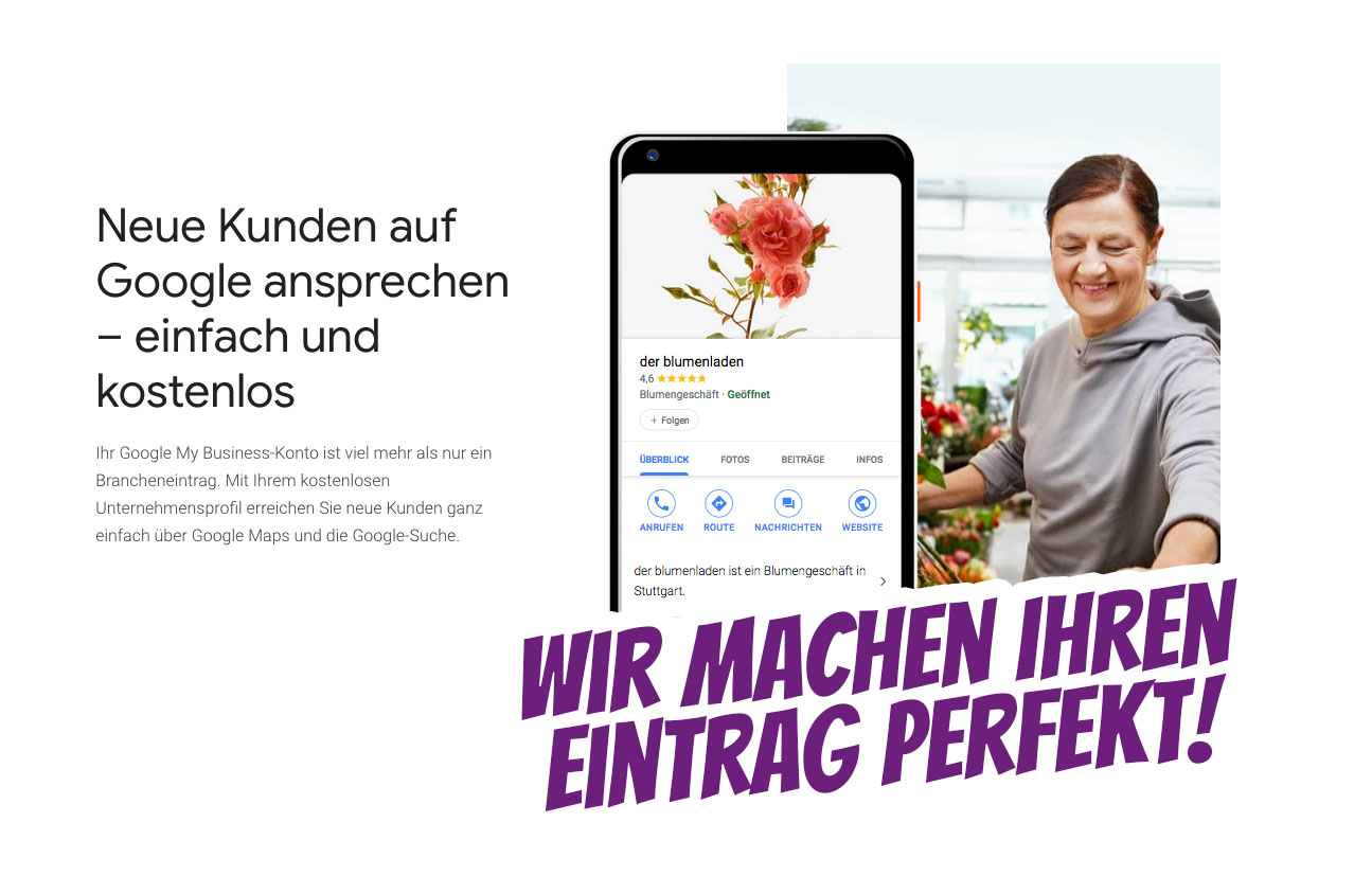 Gerade als lokales Unternehmen müssen Sie auf Google Maps über einen Google My Business Eintrag gefunden werden. Früher war es wichtig, heute ist es unerlässlich. Besonders im Einzelhandel, Ladenlokale, Restaurants, Ärzte, Rechtsanwälte, Therapeuten, Hotels und Dienstleistungen für Endverbraucher ist eine Listung mit einem kostenfreien Eintrag bei Google als führende Suchmaschine der schnellste und günstigste Weg gut gefunden zu werden – potenzielle Kunden suchen lokal und finden Ihr Geschäft – immer und überall garantiert!