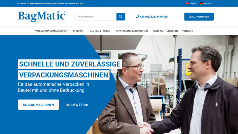 Tisch- und Standverpackungsmaschinen aus Amerika für den europäischen Markt zu vertreiben ist nicht ganz einfach. Doch angefangen mit einem umfassenden Webrelaunch in 2019 haben wir BagMatic zusammen mit Suchmaschinenoptimierung und Suchmaschinenwerbung binnen weniger Monate zum Platzhirsch in Deutschland sowie zum starken Wettbewerber in Europa geführt und optimieren bis Heute für mehr Kundenanfragen und Verkäufe von leistungsstarken Verpackungsmaschinen + Zubehör.