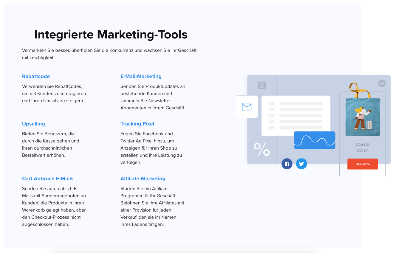 - Integrierte Funktionen: Es bietet umfassende Funktionen wie integrierte Zahlungsgateways, Marketing-Tools und detaillierte Berichte.