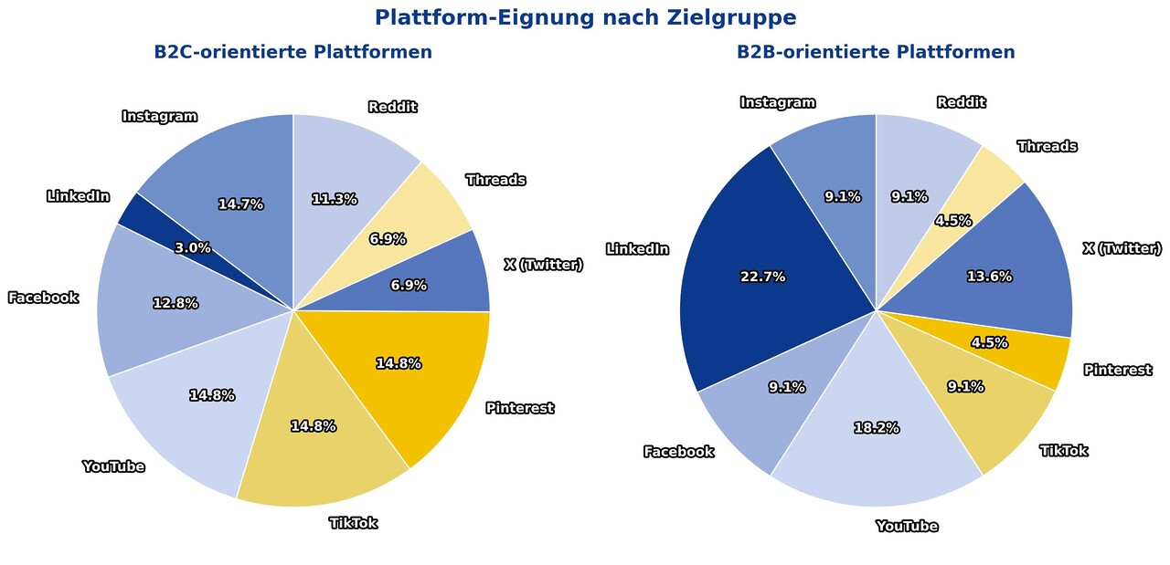 Im B2B-Bereich verschiebt sich das Bild deutlich. LinkedIn führt klar mit 22,7 % und ist die zentrale Plattform für geschäftliche Kontakte und Fachinhalte. Dahinter folgt YouTube (18,2 %), das auch im Business-Umfeld als Videoplattform sehr wichtig ist. Twitter/X gewinnt im Vergleich zu B2C an Relevanz (13,6 %), während Plattformen wie Instagram, Facebook und TikTok zwar jeweils rund 9 % ausmachen, aber eher ergänzend genutzt werden. Pinterest und Threads spielen mit rund 4,5 % nur eine kleine Rolle.