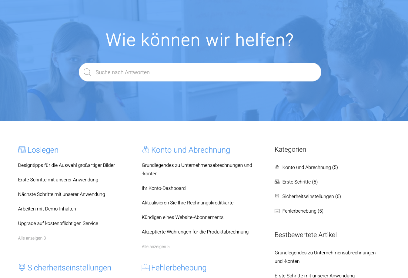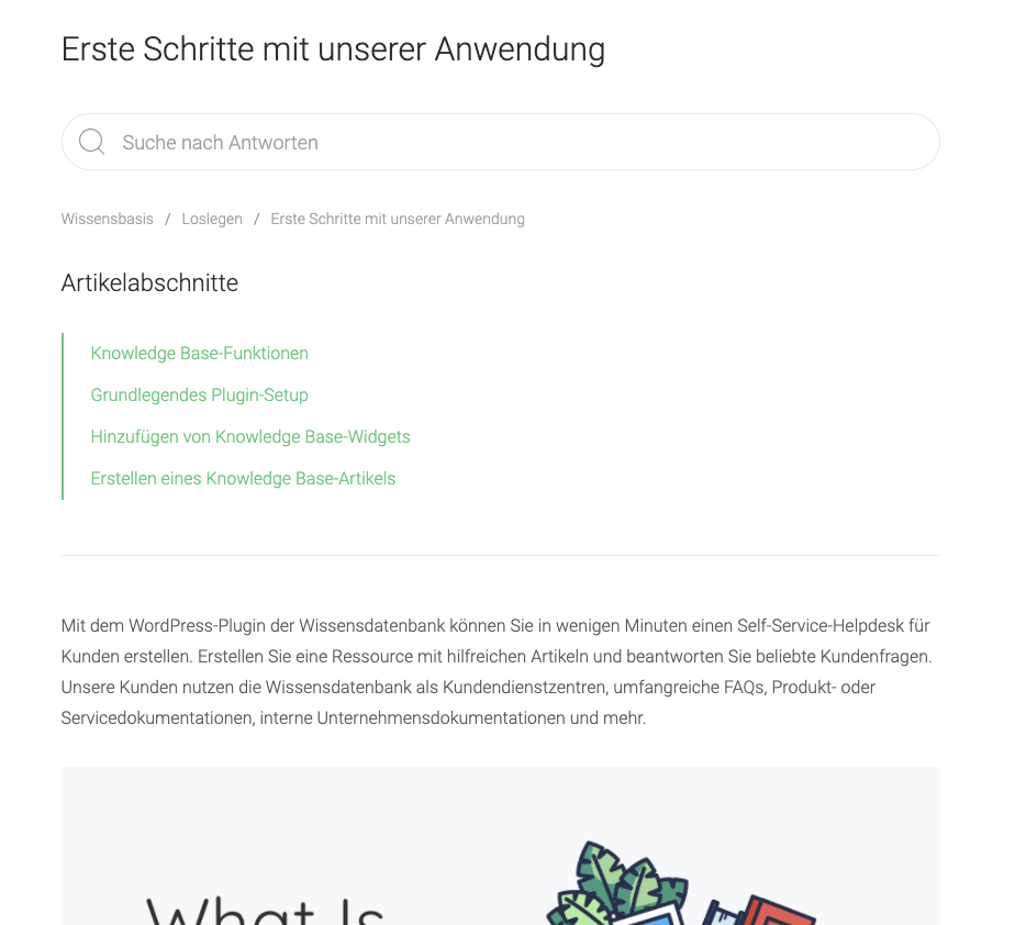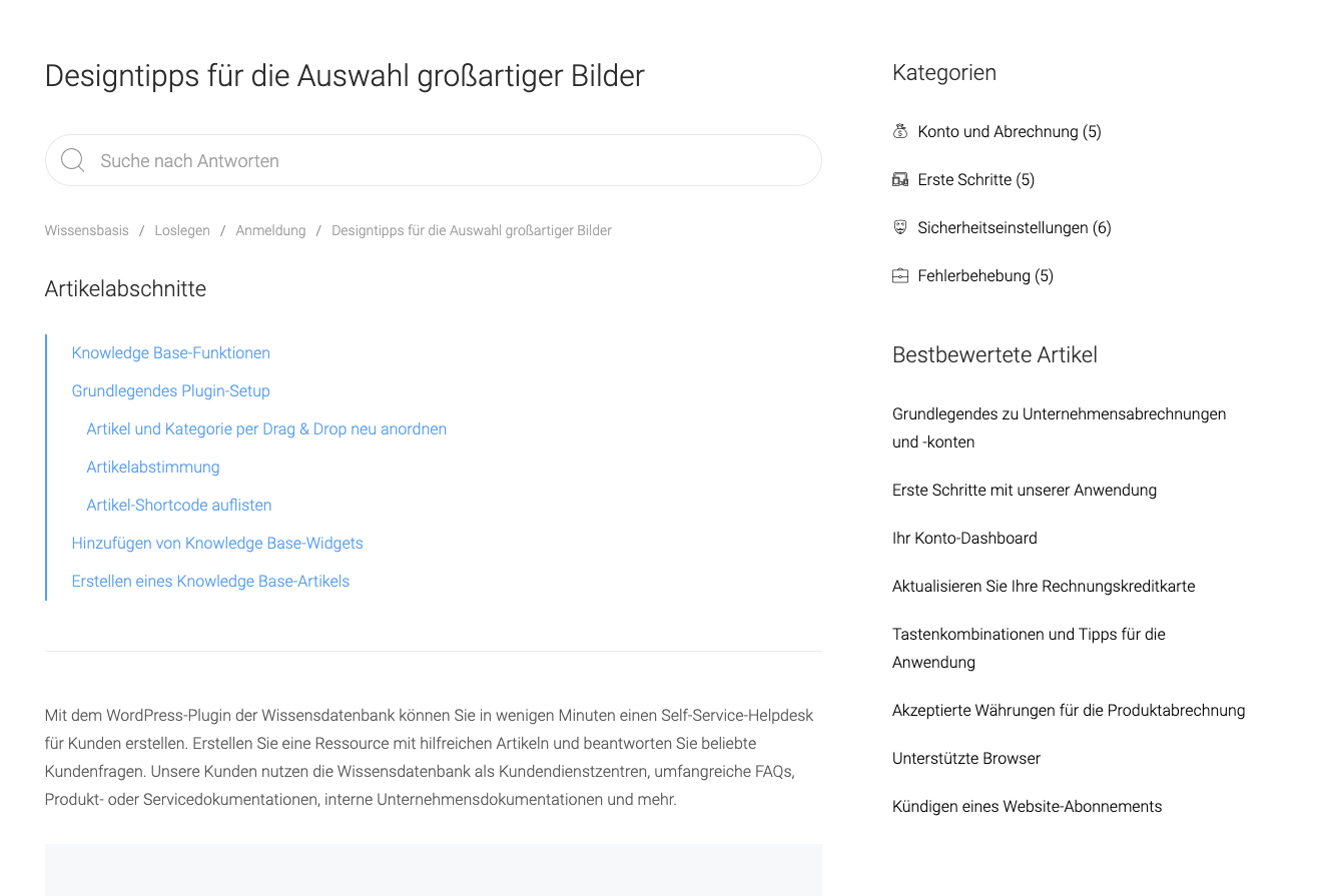 Mit dem WordPress-Plugin der Wissensdatenbank können Sie in wenigen Minuten einen Self-Service-Helpdesk für Kunden erstellen. Erstellen Sie eine Ressource mit hilfreichen Artikeln und beantworten Sie beliebte Kundenfragen. Unsere Kunden nutzen die Wissensdatenbank als Kundendienstzentren, umfangreiche FAQs, Produkt- oder Servicedokumentationen, interne Unternehmensdokumentationen, Wiki und vieles mehr.